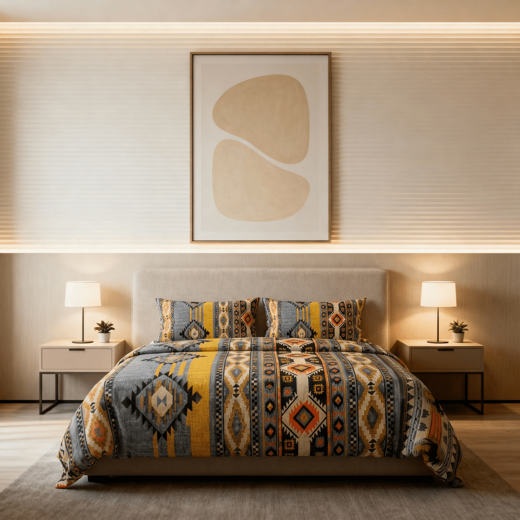 این ست روتختی و روبالشی با ترکیب اصالت و مدرنیته، جلوهای خاص به اتاقخواب شما میبخشد. طرحهای هندسی الهامگرفته از هنر سنتی و رنگهای گرم مانند زرد، خاکستری و نارنجی، انرژی و زیبایی منحصربهفردی به فضای خواب شما میدهند.