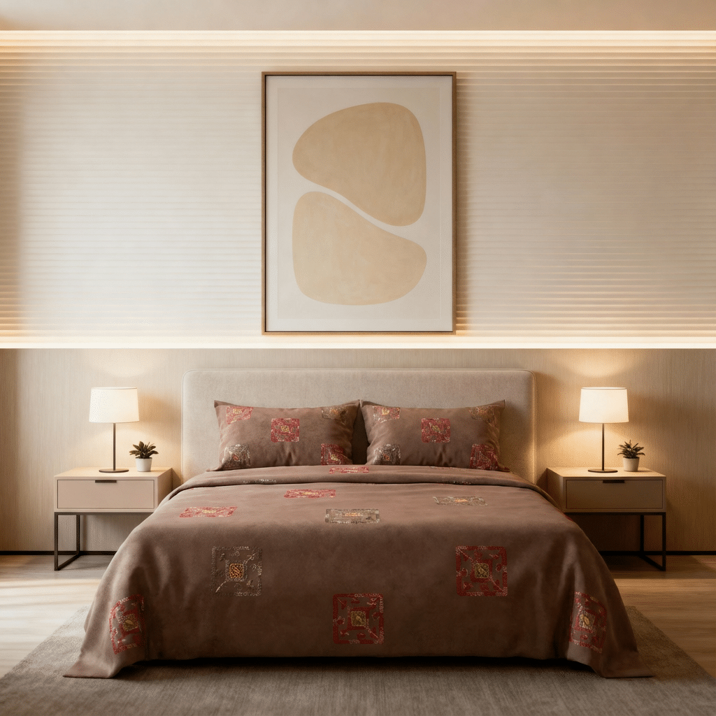 این ست روتختی زیبا با طراحی مینیمال و ظریف، جلوه‌ای از ترکیب سبک کلاسیک و مدرن را به نمایش می‌گذارد. رنگ قهوه‌ای گرم به همراه جزئیات هندسی قرمز و کرم، فضایی آرامش‌بخش و لوکس به اتاق‌خواب شما می‌بخشد.