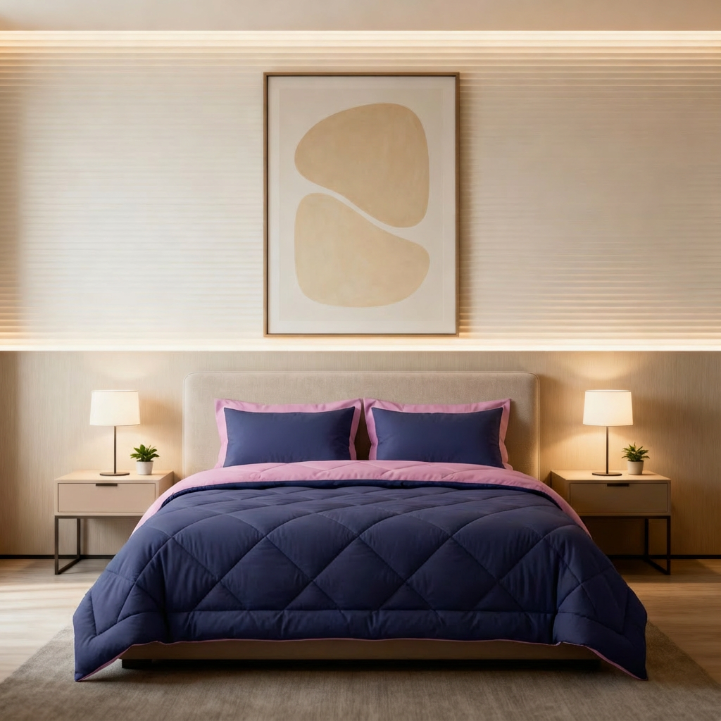 این ست روتختی و روبالشی با رنگ سرمهای عمیق و حاشیه صورتی ملایم، ترکیبی هوشمندانه از وقار، آرامش و ظرافت را به اتاقخواب شما میآورد. سرمهای حس عمق، ثبات و آرامش را القا میکند و در کنار صورتی لطیف، تعادلی زیبا و چشمنواز ایجاد میشود که فضا را هم شیک و هم صمیمی نشان میدهد.