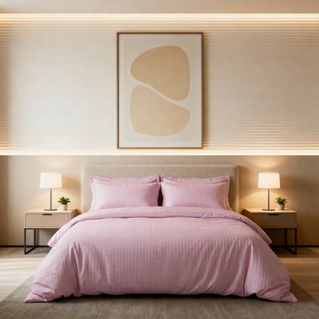 ست روتختی و روبالشی با رنگ صورتی ملایم و طرح راه‌راه ظریف، انتخابی آرامش‌بخش و شیک برای اتاق‌خواب‌های مدرن و هتلی. مناسب فضایی لطیف، دلباز و لوکس.