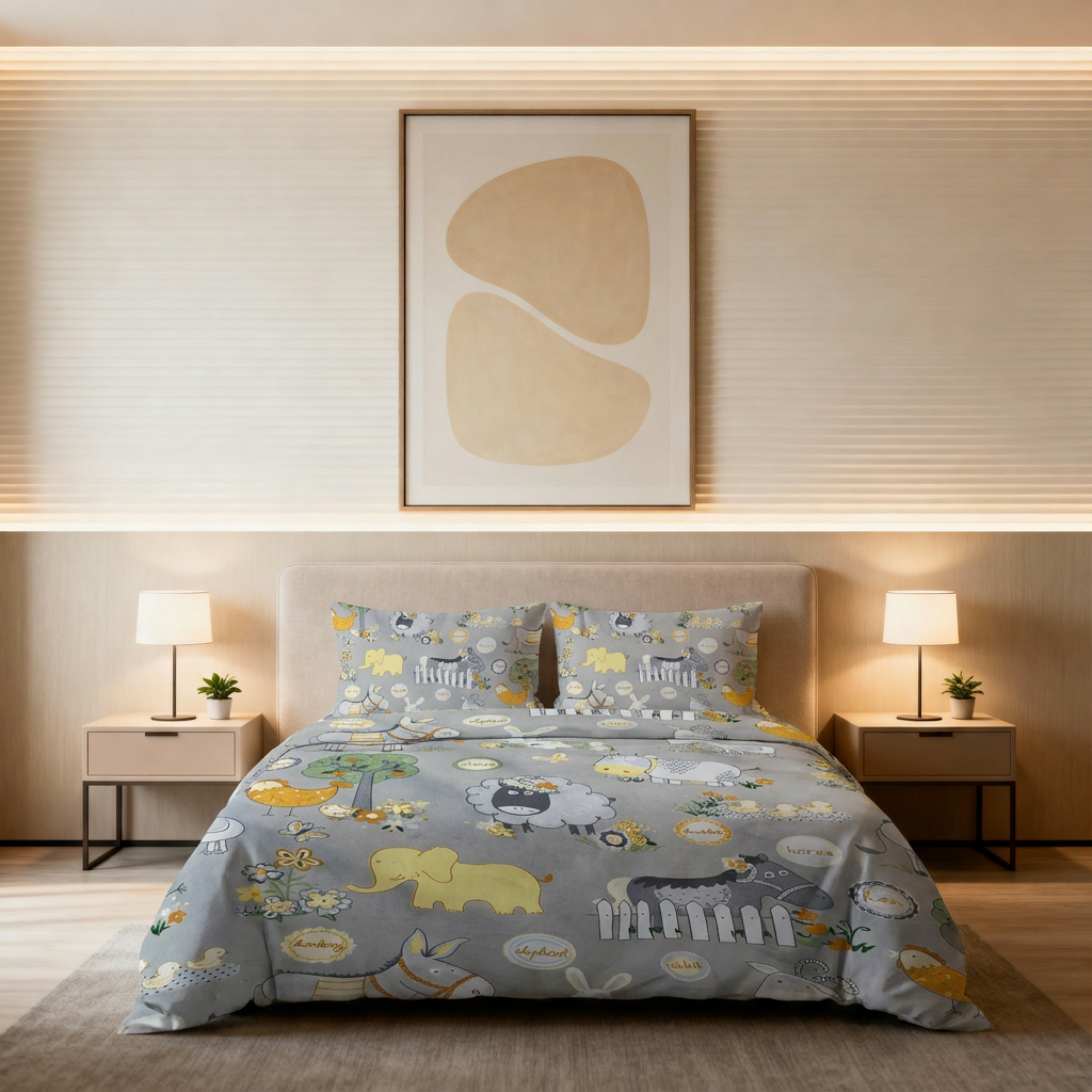 رنگ خاکستری ملایم زمینه، به همراه رنگ‌های گرم و روشن در طراحی حیوانات، ترکیبی زیبا و آرامش‌بخش ایجاد کرده است. این ست به‌راحتی با دکوراسیون‌های کودکانه هماهنگ می‌شود و فضایی شاد و خلاقانه برای بازی و استراحت کودکان فراهم می‌کند.